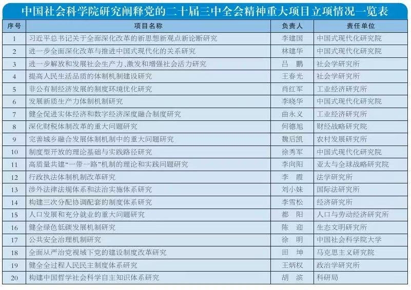 根据中国社会科学院党组部署,中国社会科学院第一时间推出一批党的二十届三中全会精神重大项目选题,面向全院公开招标,引导专家学者结合自身研究基础和学术专长开展研究,深入研究习近平总书记关于全面深化改革的一系列新思想、新观点、新论断,自觉把党的创新理论贯穿研究全过程,转化为坚定的政治信念、清醒的理论自觉、科学的思维方法。